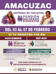 Del 3 al 7 de febrero, se realizará la entrega de tarjetas de la Pensión Mujeres Bienestar en José María Morelos #17 (Estacionamiento del Ayuntamiento).