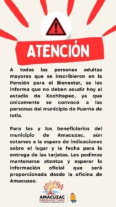 A todas las personas adultas mayores que se inscribieron en la Pensión para el Bienestar, se les informa que no deben acudir hoy al estadio de Xochitepec, ya que únicamente se convocó a las personas del municipio de Puente de Ixtla.