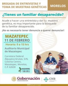 El Ayuntamiento de Amacuzac, a través de la Dirección de la Procuraduría de la Defensa del Menor y la Instancia Municipal de la Mujer, invita a todas las personas que tengan familiares desaparecidos a participar en la Brigada de Entrevistas y Toma de Muestras Genéticas organizada por la Comisión Nacional de Búsqueda.
