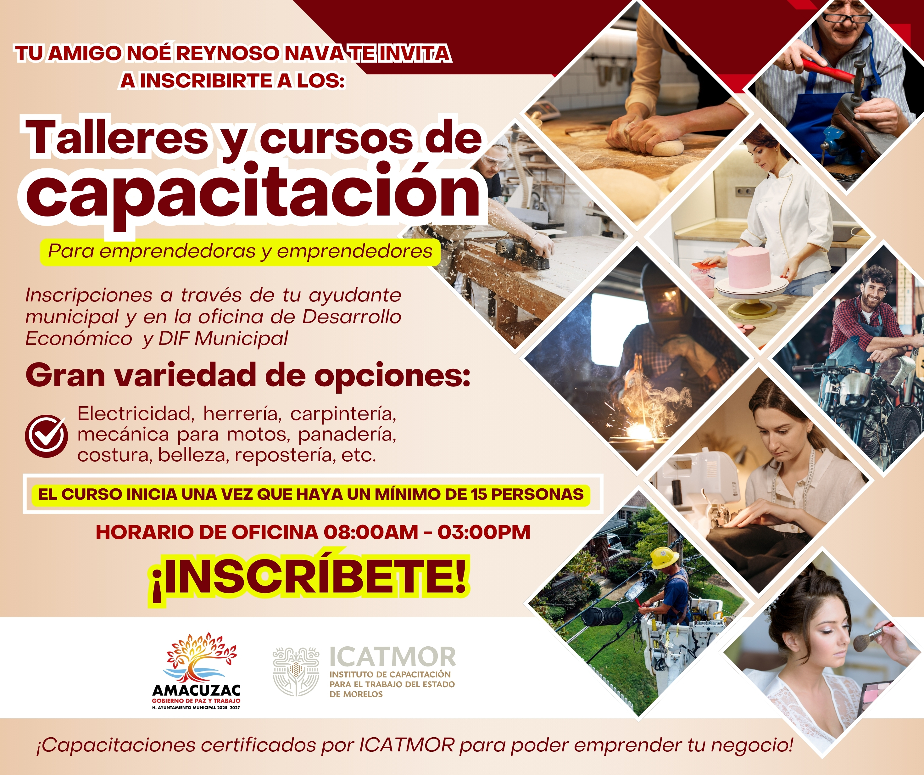 El H. Ayuntamiento de Amacuzac 2025–2027, encabezado por el presidente municipal Noé Reynoso Nava, en coordinación con la Dirección de Desarrollo Económico y el Sistema DIF Municipal, pone en marcha el programa de Talleres y Cursos de Capacitación para emprendedoras y emprendedores.