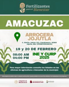 Productores de Amacuzac, los días 19 y 20 de febrero, de 08:00 AM a 04:00 PM, se llevará a cabo la entrega de Fertilizantes para el Bienestar en la Arrocera Jojutla (C. Benito Juárez 143, Cuauhtémoc, Jojutla, Mor.).