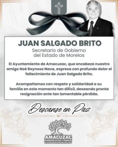 El Ayuntamiento de Amacuzac, que encabeza nuestro amigo Noé Reynoso Nava, expresa su más profundo pesar por el sensible fallecimiento del Lic. Juan Salgado Brito, Secretario de Gobierno del Estado de Morelos.