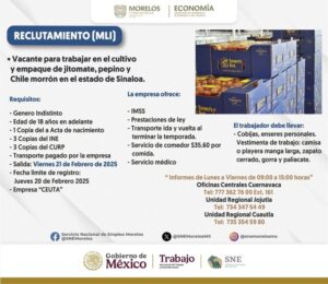 La Dirección de Desarrollo Económico del municipio de Amacuzac informa sobre la siguiente vacante para trabajar en el cultivo y empaque de jitomate, pepino y chile morrón en el estado de Sinaloa.