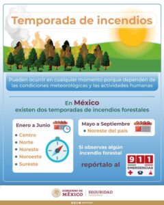Recuerda que en México existen dos temporadas críticas de incendios forestales: de enero a junio (en el centro, norte, noreste, noroeste y sureste) y de mayo a septiembre (en el noreste del país). Si observas algún incendio forestal, repórtalo al 911.