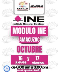 El Ayuntamiento de Amacuzac informa a la ciudadanía que durante el mes de octubre estará disponible el Módulo del Instituto Nacional Electoral (INE) en nuestro municipio.