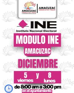 El Ayuntamiento de Amacuzac informa a la ciudadanía mañana viernes 5 y el 8 de diciembre estará la visita del Módulo del Instituto Nacional Electoral (INE) en nuestro municipio.